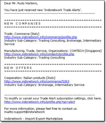 by specify your Trade Alert subscription to buy, sell or cooperation offers and companies that you wish to receive.